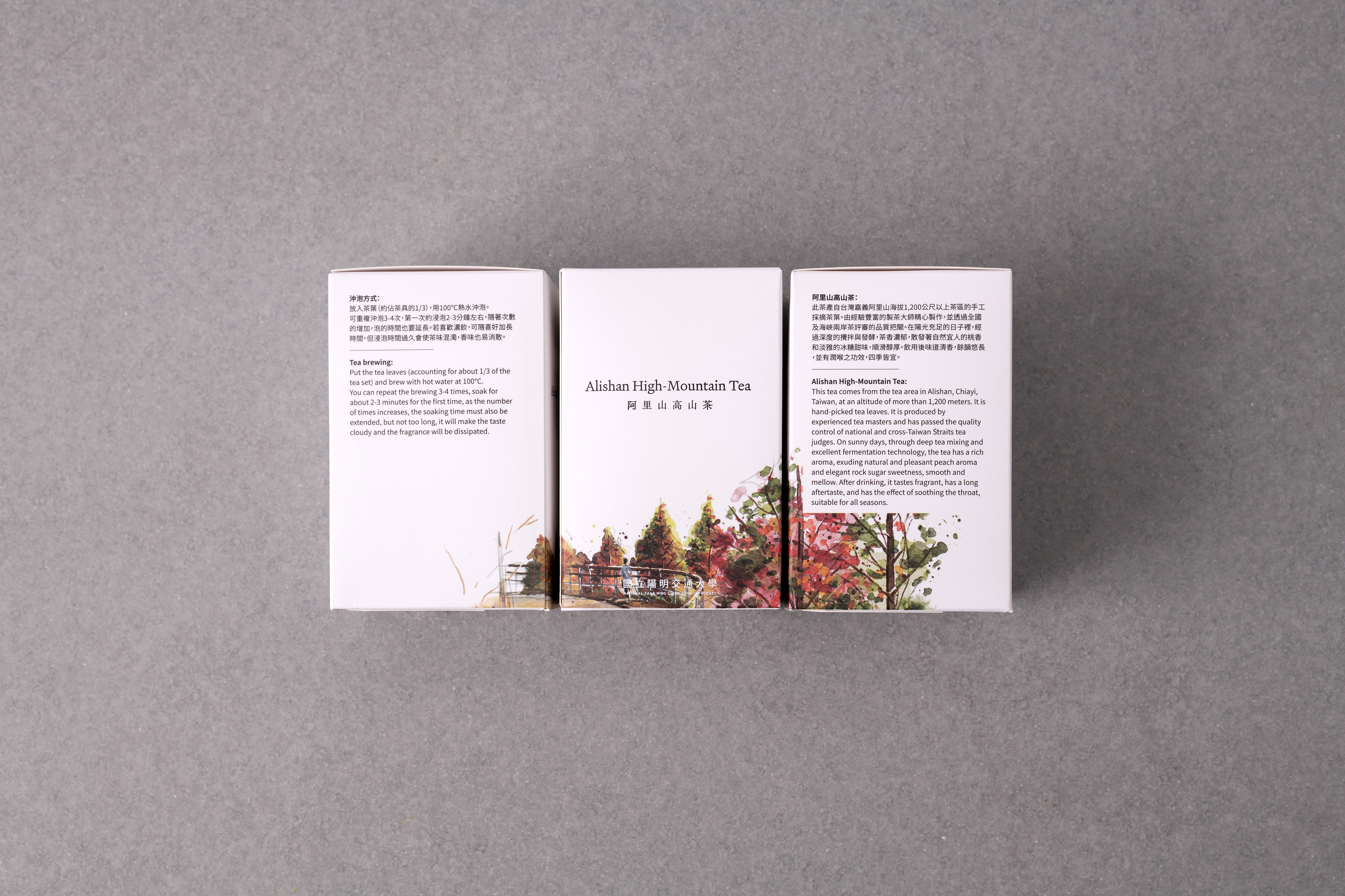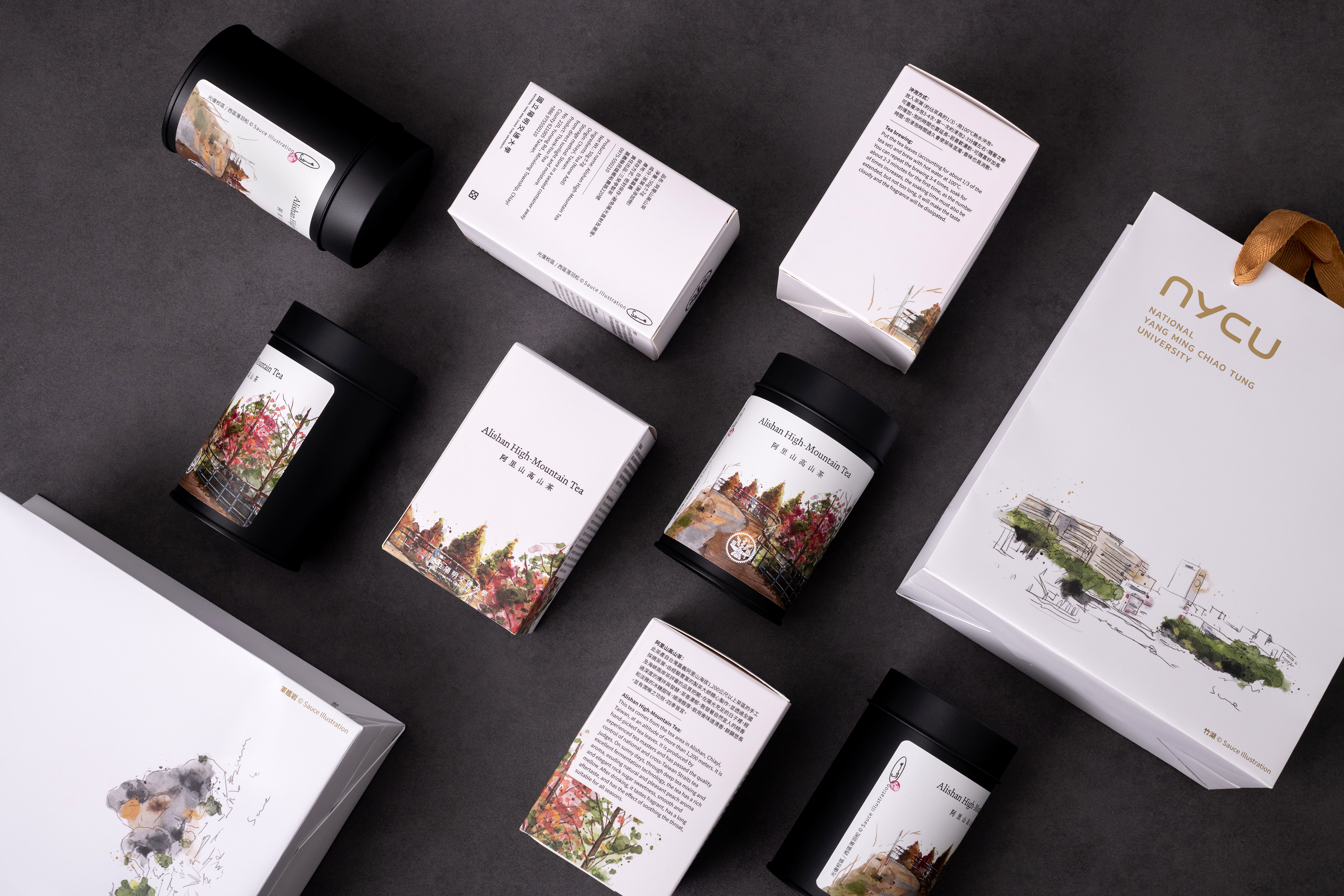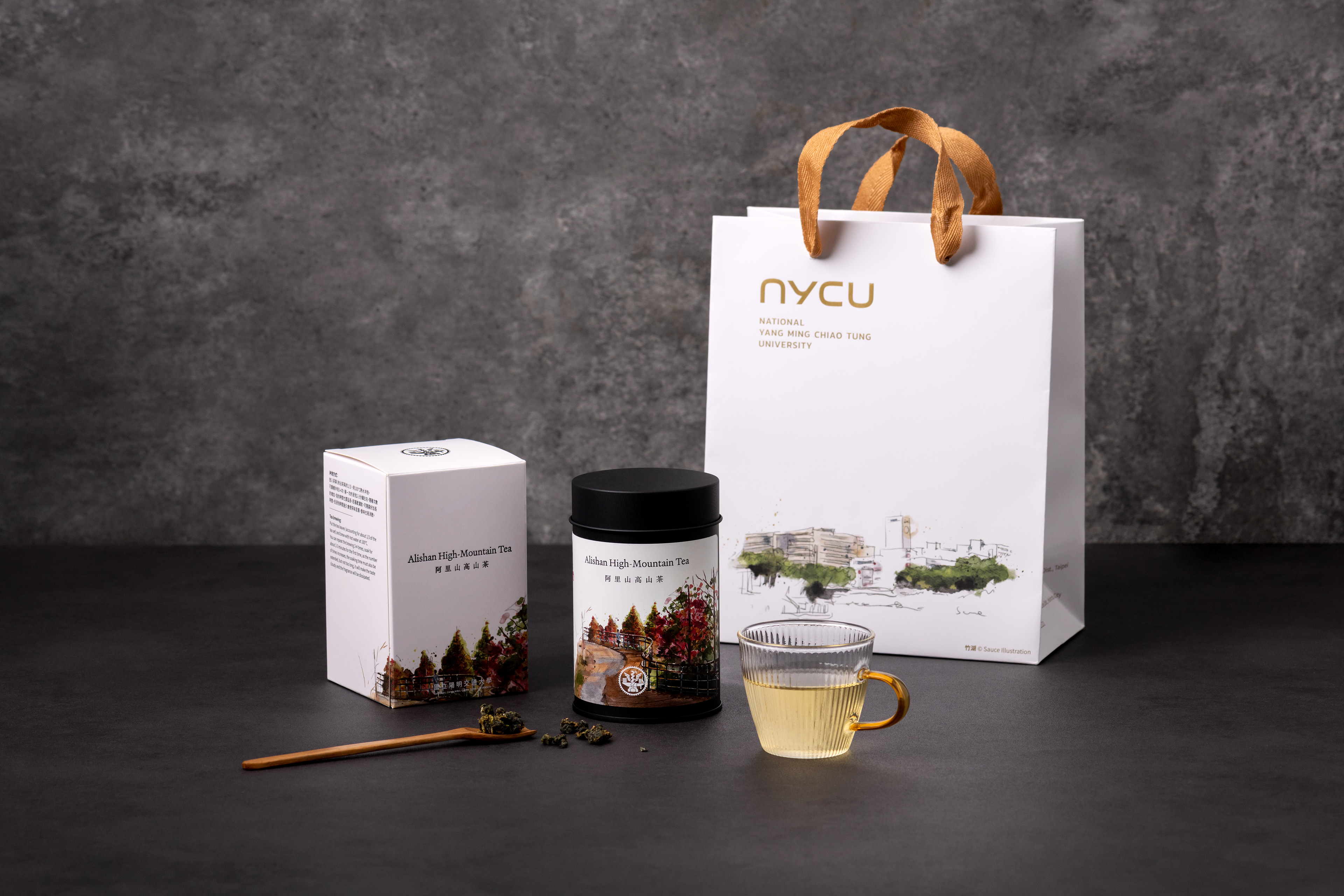 這次為陽明交大紀念品中心設計的「阿里山高山茶葉禮盒」,在包裝材質上跳脫以往的選擇。整體設計以高雅、精緻且兼具永續為出發點,希望傳遞出優雅而內斂的氣質。金屬茶葉罐不僅提升整體質感,也兼具實用性,未來可作為收納容器延續使用。